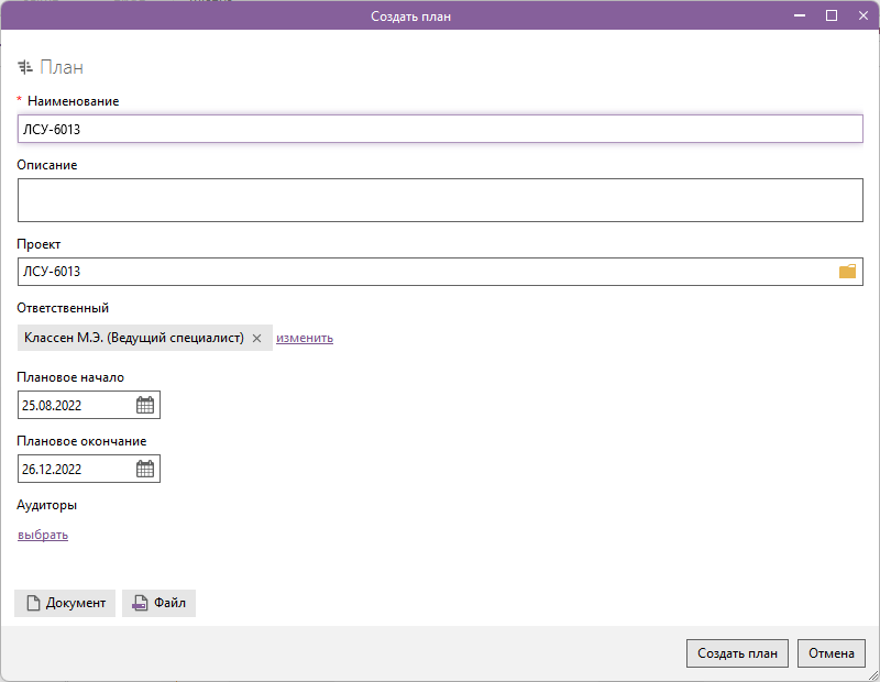 - Заполните основные атрибуты плана и выберите проект, к которому относится план;