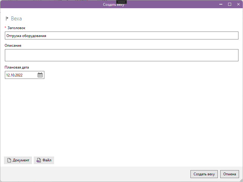 - Находясь в окне проекта, нажмите Создать → Веха;