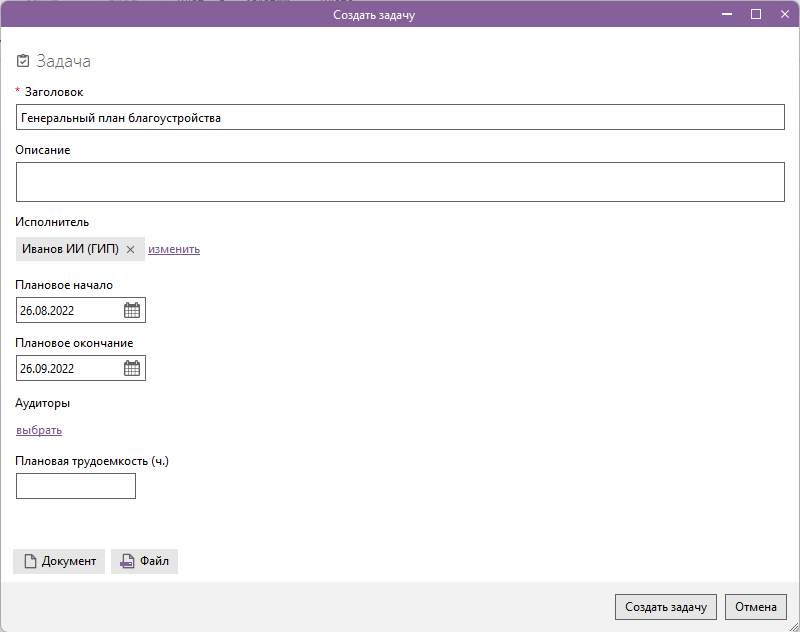 - Заполните основные атрибуты задачи и выберите исполнителя;