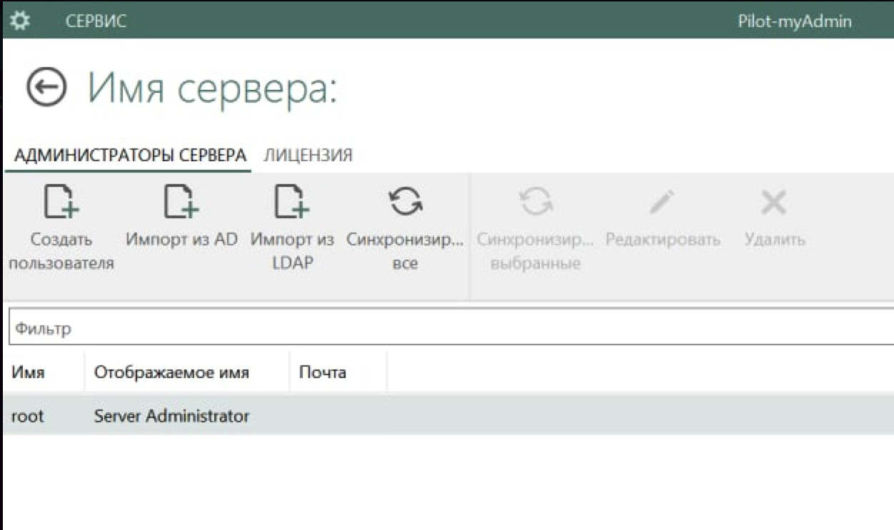 Администратор сервера Pilot - это пользователь обладающий правами загрузки конфигурации в базы данных Pilot. Он задается в MyAdmin → Настройки сервера → Администраторы сервера.