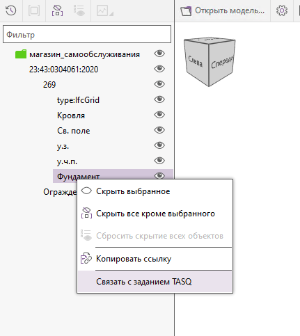 В дереве объектов модели выбрать нужный элемент модели и через его контекстное меню выбрать команду “Связать с заданием TASQ”