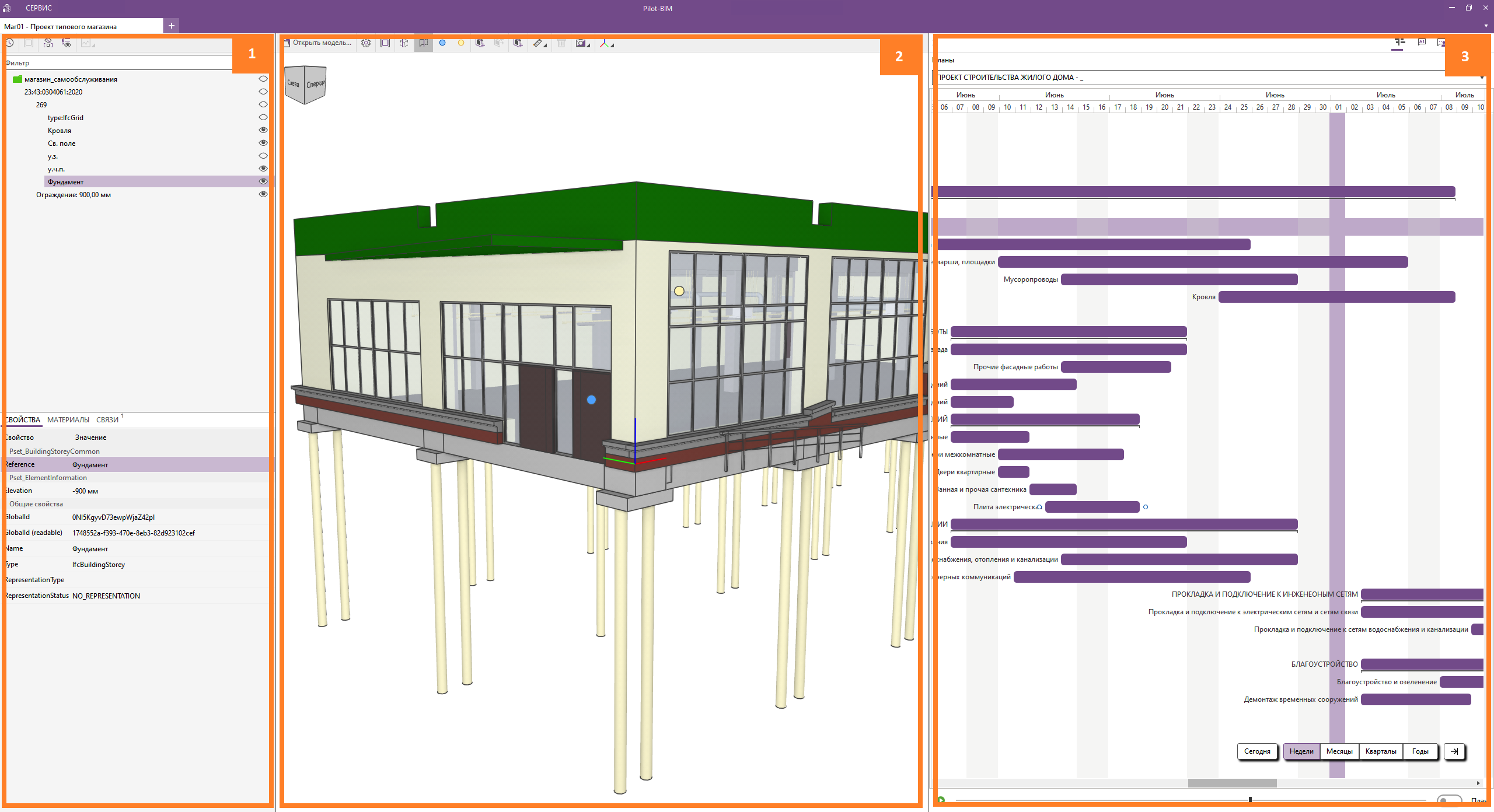 Окно BIM-плеера обеспечивает визуализацию хода проекта с помощью диаграммы Ганта и 3D-модели объекта. Функциональность позволяет увидеть, как объект будет выглядеть на разных этапах создания. Этот инструмент также позволяет анализировать сроки работ, план объемов и загрузку ресурсов. Он помогает предвидеть планируемые результаты создания объекта и избегать пространственно-временных коллизий и срывов сроков реализации проекта.