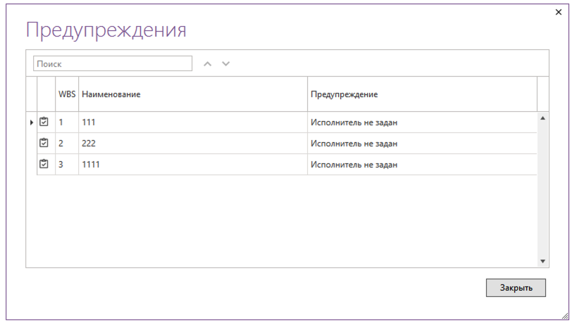 Открыв меню предупреждений, выберите "Подробнее..." и откроется список со всеми предупреждениями, кликнув на любое предупреждение, курсор плана переместится на проблемную задачу.