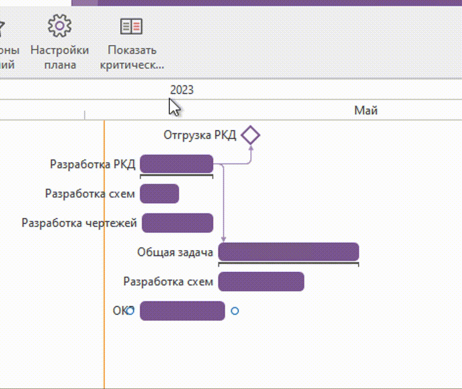 Для того, чтобы подсветить критический путь проекта в Ганте, необходимо нажать кнопку Показать критический путь в главном меню.