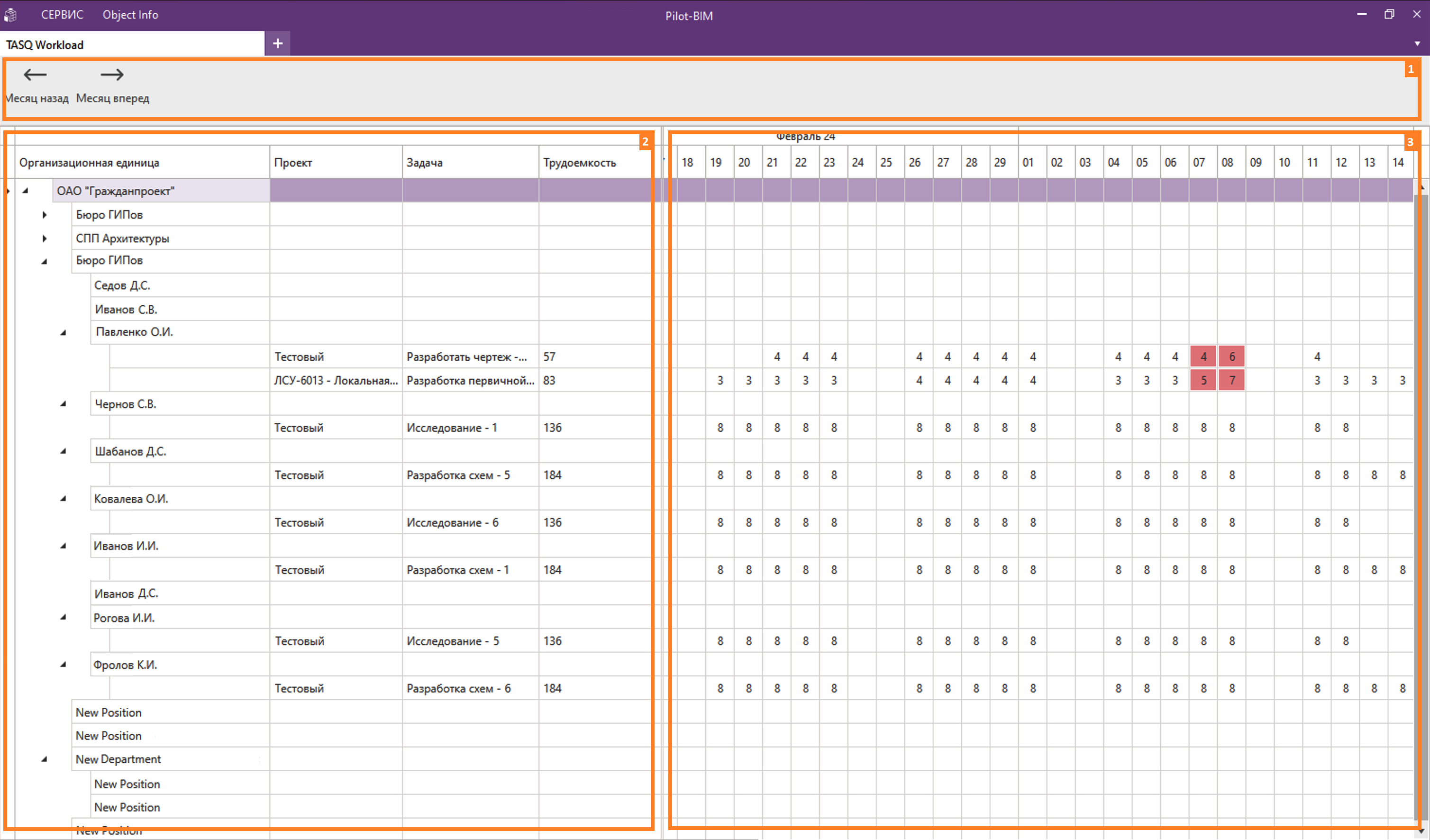 - Если на конкретный день ресурсу запланировали время превышающее время выставленное ему в рабочем расписании, то данная ячейка подсветится красным цветом, что будет означать о перегрузе ресурса